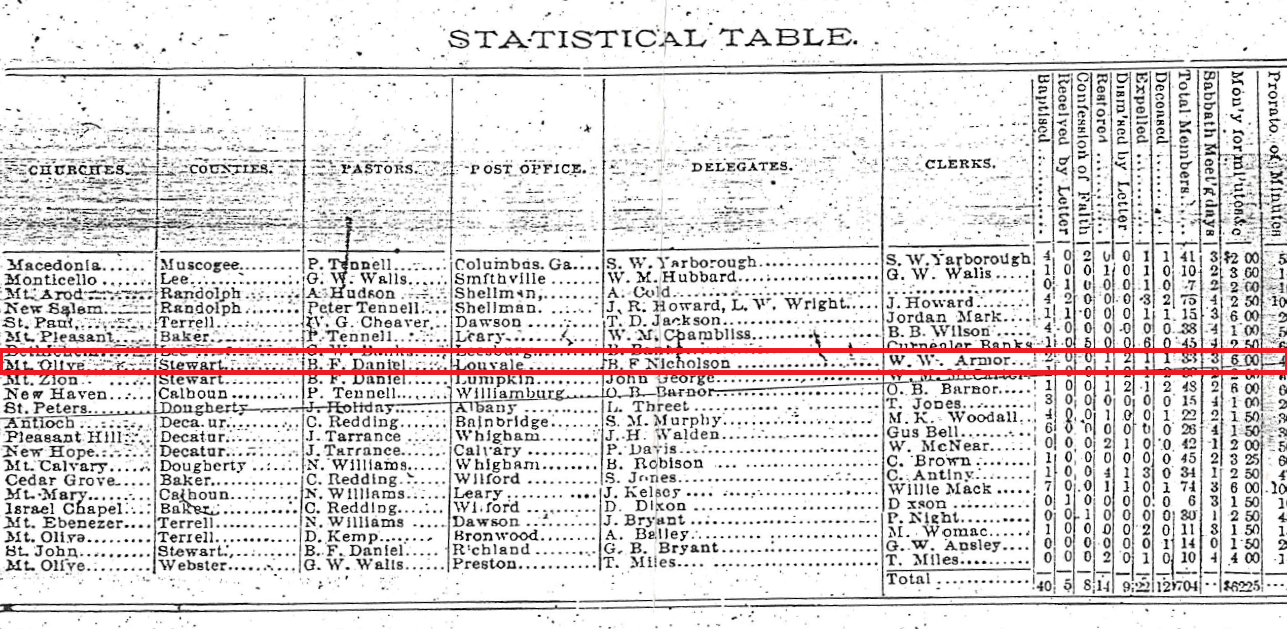 My aunt was able to get a copy of church minutes from the 10th Annual session of The Union Primitive Baptist Association. This session was held with Macedonia Church in my hometown of Columbus, Georgia, October 17 – 19, 1890. Mt. Olive was represented by Elder B. F. Daniel, B. F. Nicholson and W. W. Armor. The Church had 33 members in 1890.